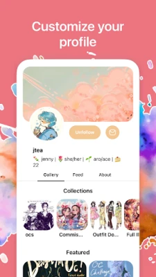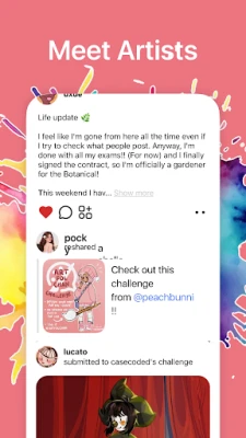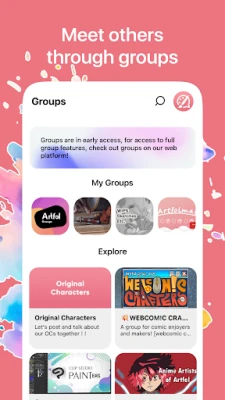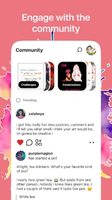 Artfol предлага богати възможности за изява и взаимодействие. Разгледайте специалния раздел за общностни предизвикателства, присъединете се към съществуващи или създайте свои собствени, за да вдъхновите другите. Персонализирайте своя профил до последния детайл: изберете кои творби да посрещат посетителите ви, качете уникални снимка и банер, подберете тема и напишете кратко представяне. Можете дори да добавите раздел за поръчки, ясно показвайки, че сте отворени за нови проекти. Открийте или създайте групи с артисти с подобни интереси, участвайте в ексклузивни събития и споделяйте изкуство в лични пространства.