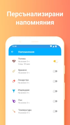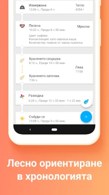Но възможностите на приложението не спират дотук. То ви дава контрол върху проследяването на къпанията, телесната температура, разходките и приема на медикаменти. Използвайте удобни таймери за кърмене и сън, които можете лесно да спирате и рестартирате, а за още по-бърз достъп, визуализирайте ги директно в лентата с известия. Поддържайте актуален дневник с ръста и теглото на вашето дете, с опция за почти ежедневно въвеждане. Настройте персонализирани напомняния за всяко събитие и управлявайте грижите дори за близнаци или няколко бебета едновременно.