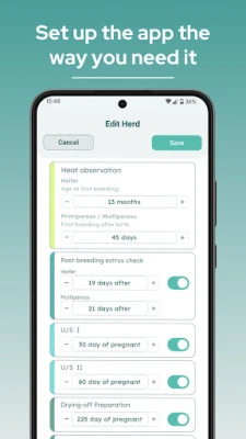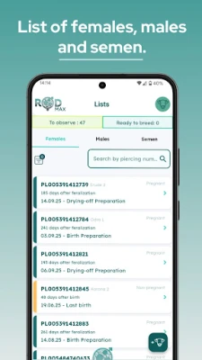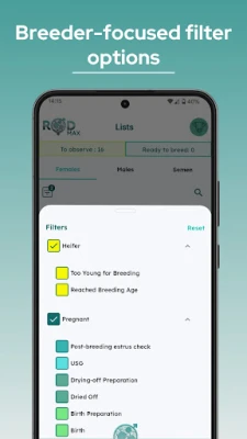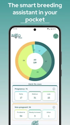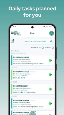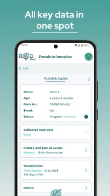 С ROD получавате пълен и винаги актуален преглед на цялото си стадо – от бременни и сухостойни животни до такива, които предстои да се отелят или са готови за осеменяване. Всички ключови данни са на една ръка разстояние, позволявайки ви да вземате бързи и информирани решения. Приложението автоматично генерира ежедневни планове за действие, елиминирайки нуждата от хартиени календари и бележници. Това включва и автоматизиран план за грижи за всяка осеменена женска, гарантирайки, че никога няма да пропуснете важен етап от нейното развитие, което води до по-кратки интервали между отелванията и по-високи приходи.